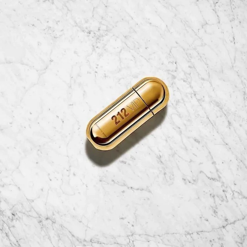 O frasco do perfume 212 VIP representa o puro objeto de desejo, o encanto do brilho dourado traz luz para o produto. Curvas femininas e atraentes. Detalhe para a tampa magnética.