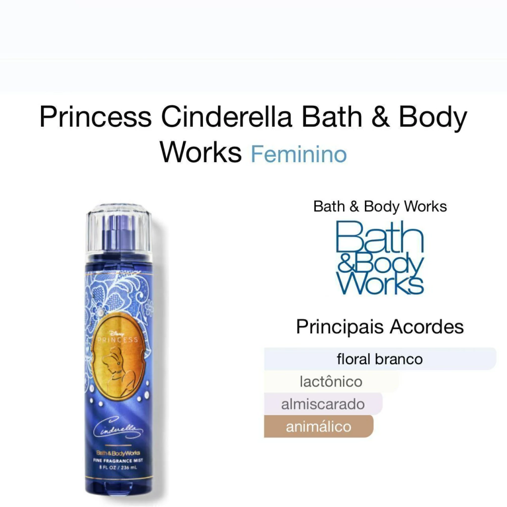 Descubra a magia e a elegância do Body Splash Cinderela da Bath & Body Works. Este encantador spray corporal de 236ml é ideal para quem deseja adicionar um toque de frescor e fragrância ao seu dia a dia.