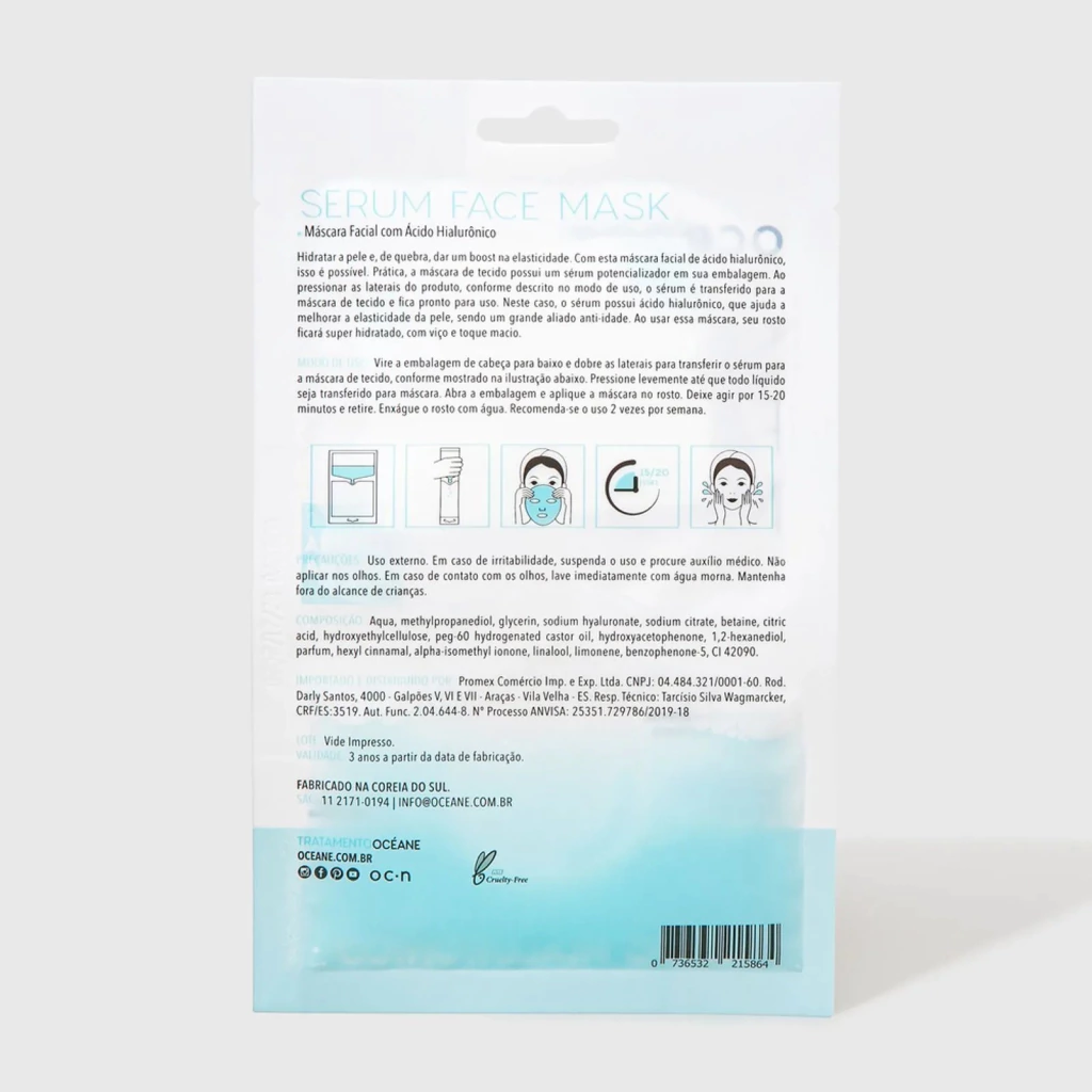 Oceane Máscara Facial com Ácido Hialurônico - Máscara Coreana 20ml oferece hidratação profunda e revitalização para sua pele. Enriquecida com ácido hialurônico, promove intensa reposição de água, deixando a pele mais firme, luminosa e com aspecto saudável. Ideal para todos os tipos de pele, esta máscara coreana é prática e eficiente para o cuidado diário. Experimente e sinta a diferença na textura e no viço do seu rosto!