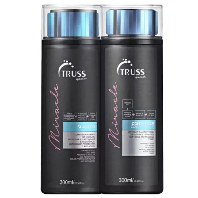 Transforme seus cabelos com o Kit Miracle da Truss! Este conjunto essencial combina um shampoo de 300ml com um condicionador de 300ml, proporcionando cuidado completo para todos os tipos de cabelo.